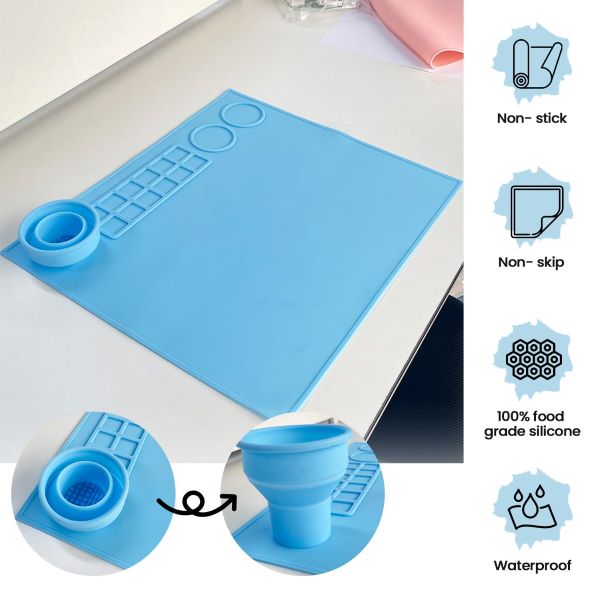 Ta vodoodporna, nelepljiva in nedrseča podloga, izdelana iz 100-odstotnega živilskega silikona, je kot nalašč za vse vaše ustvarjalnne potrebe. S 14 jamicami in območjem za mešanje je kot nalašč za organizacijo vaših potrebščin.