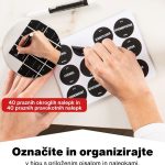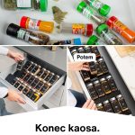 - VNESITE RED V SVOJO KUHINJO – Ta komplet vsebuje 6 organizatorjev predalov, 24 kozarčkov za začimbe, 280 črnih nalepk, krtačko, dva stresalnika in lijak.