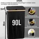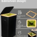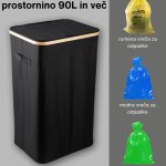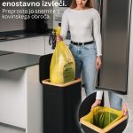 Ta model se ponaša z ojačanimi šivi, trpežnimi materiali in estetsko dovršeno črno barvo, ki se brez težav zlije s katerimkoli prostorom – bodisi moderno pisarno ali minimalistično kuhinjo. Njegova kompaktna, a prostorna zasnova omogoča učinkovito recikliranje, brez da bi zavzel preveč prostora. Poleg tega je košu dodan bambusov okvir z železnim obročem, na katerega se pritrdi vrečka za smeti, kar omogoča enostavno menjavo in uporabo. Koš je zasnovan za 90l vrečke za smeti, vendar lahko brez težav uporabite tudi večje.