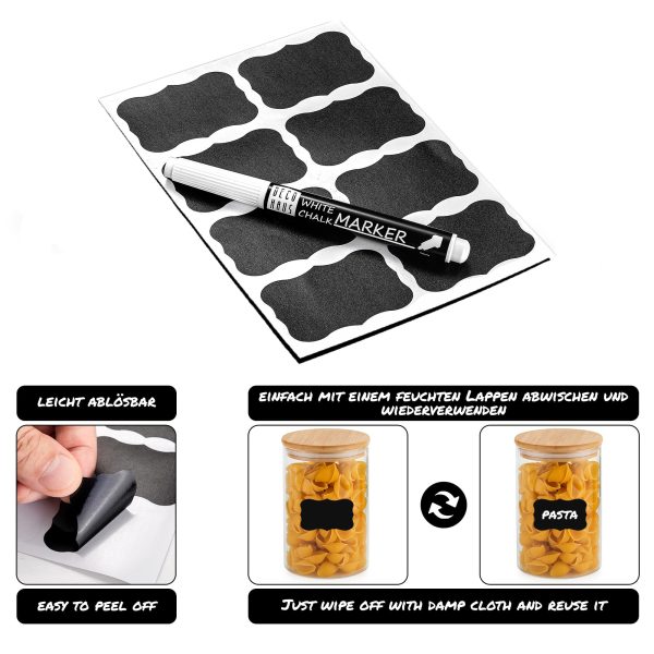 Poleg steklenih kozarcev boste prejeli tudi 16 praktičnih samolepilnih nalepk, ki jih lahko uporabite za označevanje posod za shranjevanje, vrat omaric ali stojal za začimbe s priloženim krednim pisalom. Nalepke lahko kadar koli pobrišete in nanje ponovno pišete.