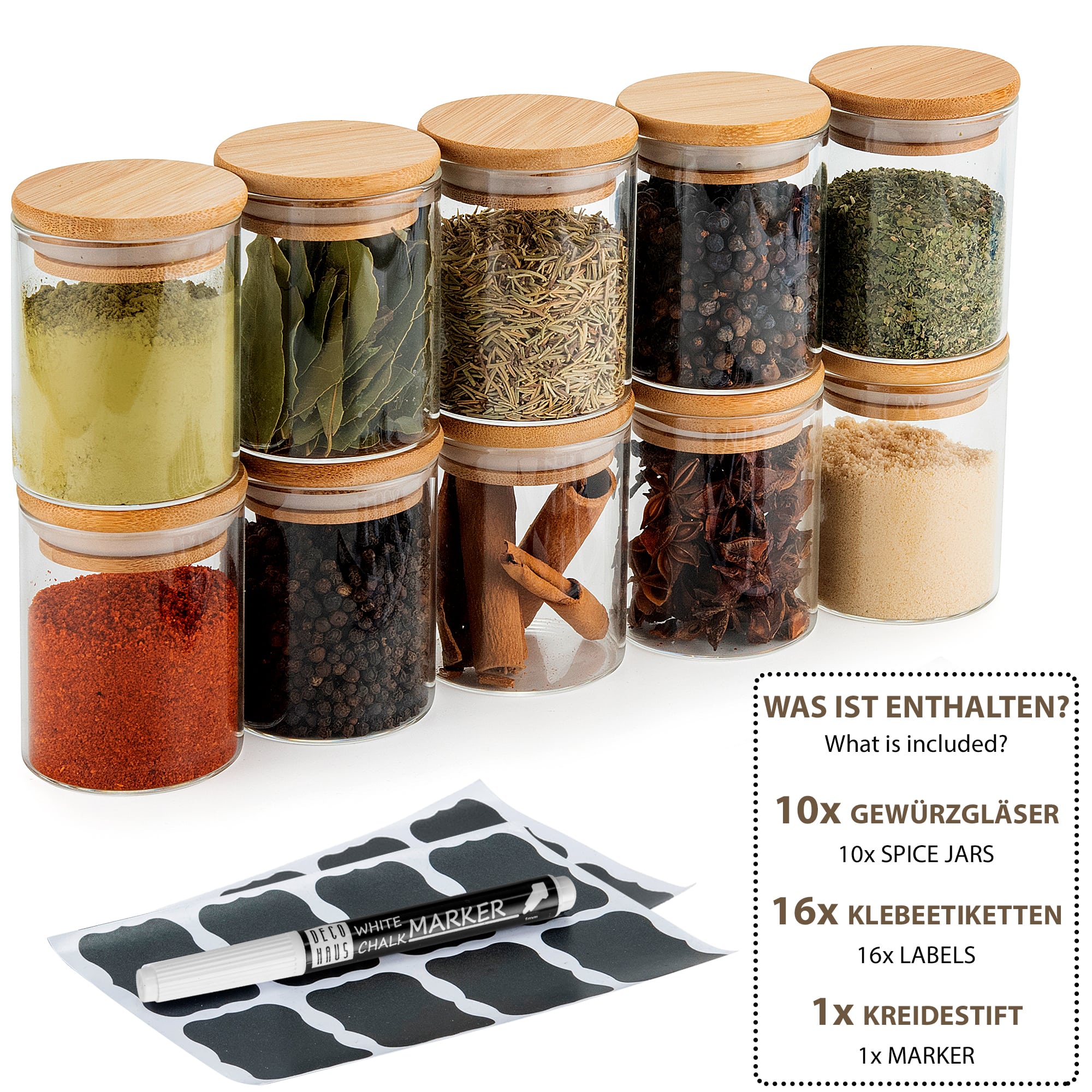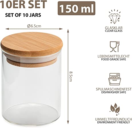 Komplet 10 kozarcev za večkratno uporabo z bambusovim pokrovom – nepredušni, za pomivalni stroj in mikrovalovno pečico – za piškote, testenine, suho hrano, kosmiče, kavo – višina 8,5 cm, premer 6,5 cm