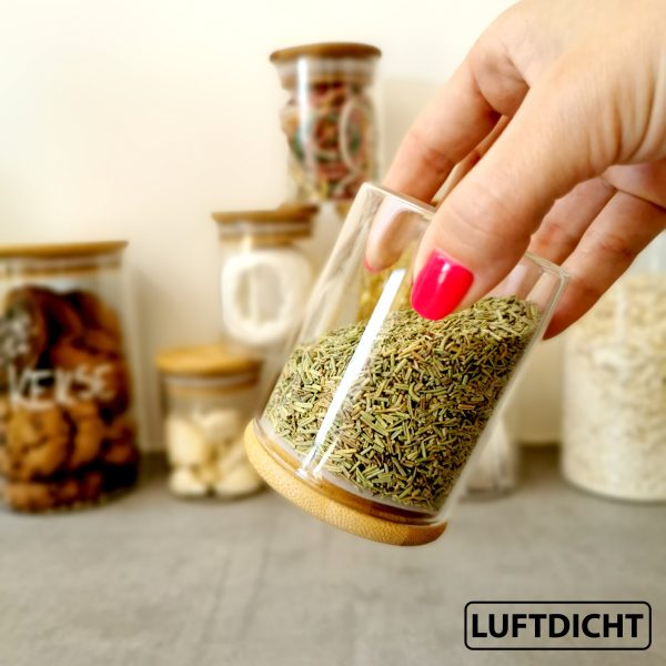 OPTIMALNA ORGANIZACIJA – Z našimi praktičnimi kozarci z bambusovim pokrovom bo vaša kuhinja vedno urejena. Ne glede na to, ali boste kozarce hranili na kuhinjskem pultu, v kredenci, shrambi ali omari, boste takoj našli, kar potrebujete!