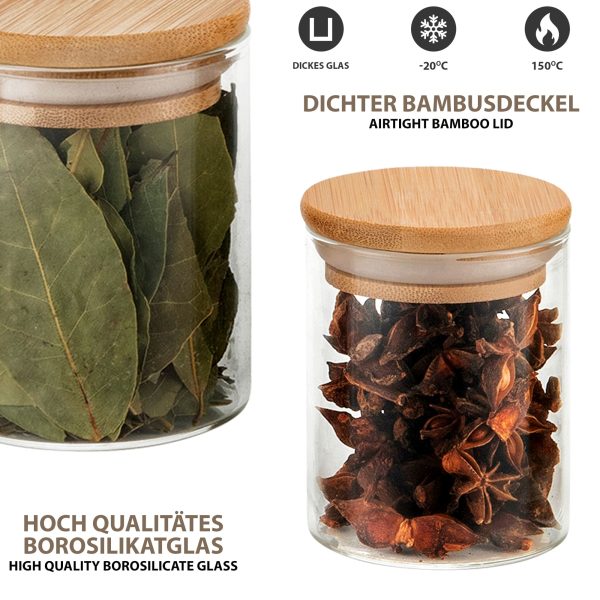 Stekleni kozarci so izdelani izključno iz visokokakovostnega in trdnega borosilikatnega stekla, ki je odporno na temperaturo in varno za živila. Pokrovi so izdelani iz trpežnega bambusa in imajo silikonsko tesnilo, ki omogoča nepredušno zaprtje kozarcev.
