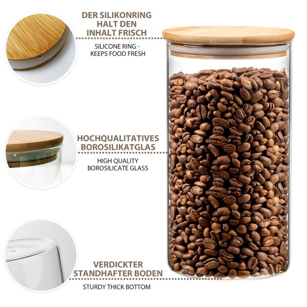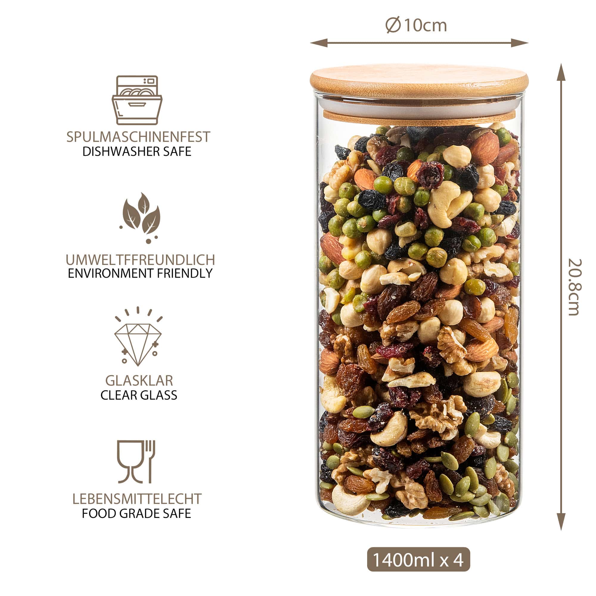 Komplet 4 kozarcev za večkratno uporabo z bambusovim pokrovom – nepredušni, za pomivalni stroj in mikrovalovno pečico – za piškote, testenine, suho hrano, kosmiče, kavo – višina 20 cm, premer 10 cm