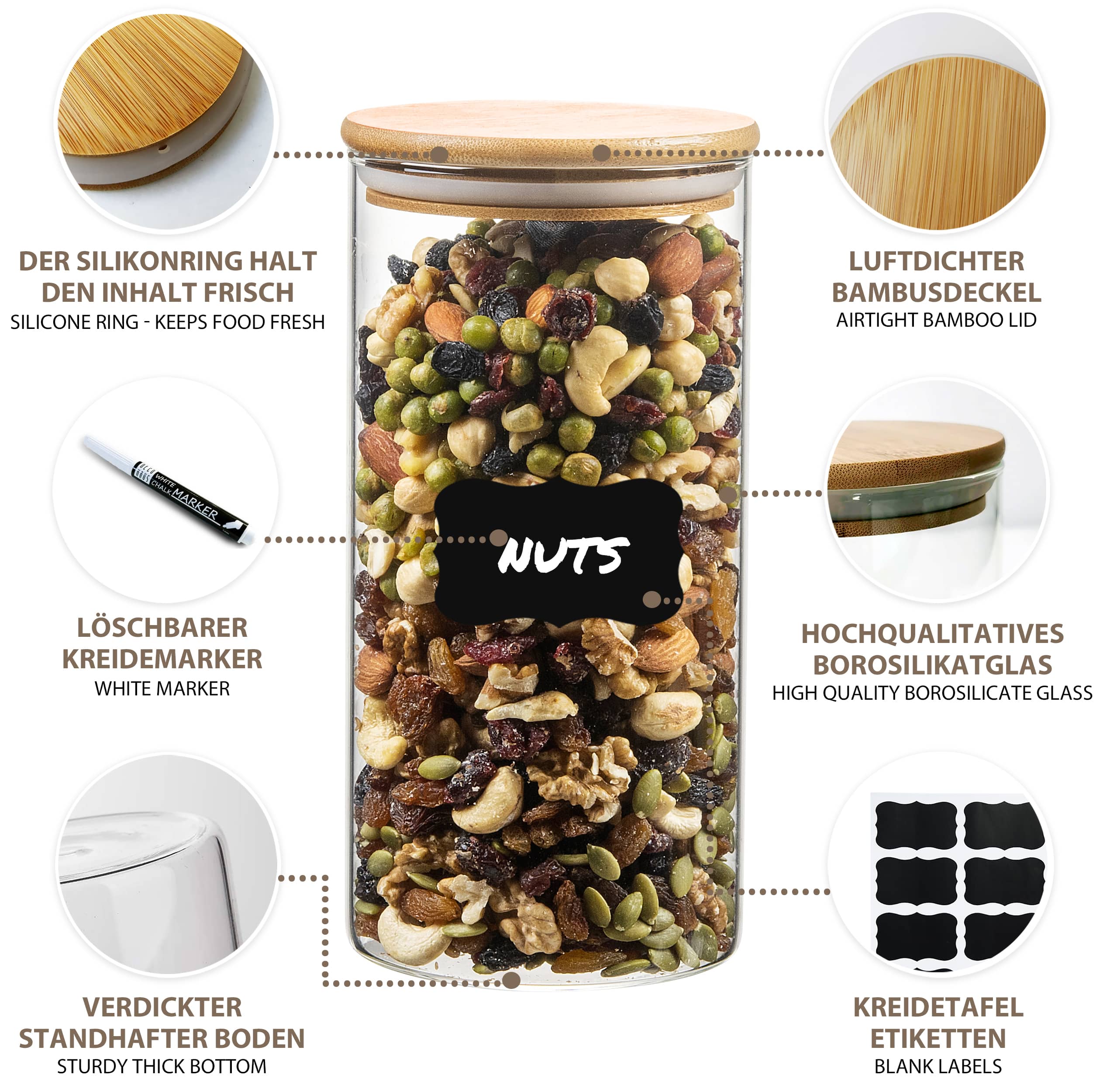 OPTIMALNA ORGANIZACIJA – Z našimi praktičnimi kozarci z bambusovim pokrovom bo vaša kuhinja vedno urejena. Ne glede na to, ali boste kozarce hranili na kuhinjskem pultu, v kredenci, shrambi ali omari, boste takoj našli, kar potrebujete!