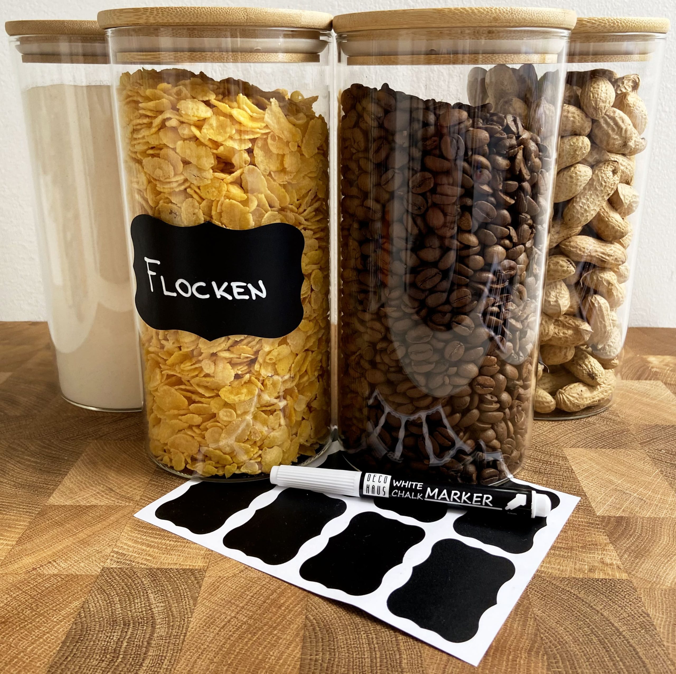 Poleg steklenih kozarcev boste prejeli tudi 8 praktičnih samolepilnih nalepk, ki jih lahko uporabite za označevanje posod za shranjevanje, vrat omaric ali stojal za začimbe s priloženim krednim pisalom. Nalepke lahko kadar koli pobrišete in nanje ponovno pišete.