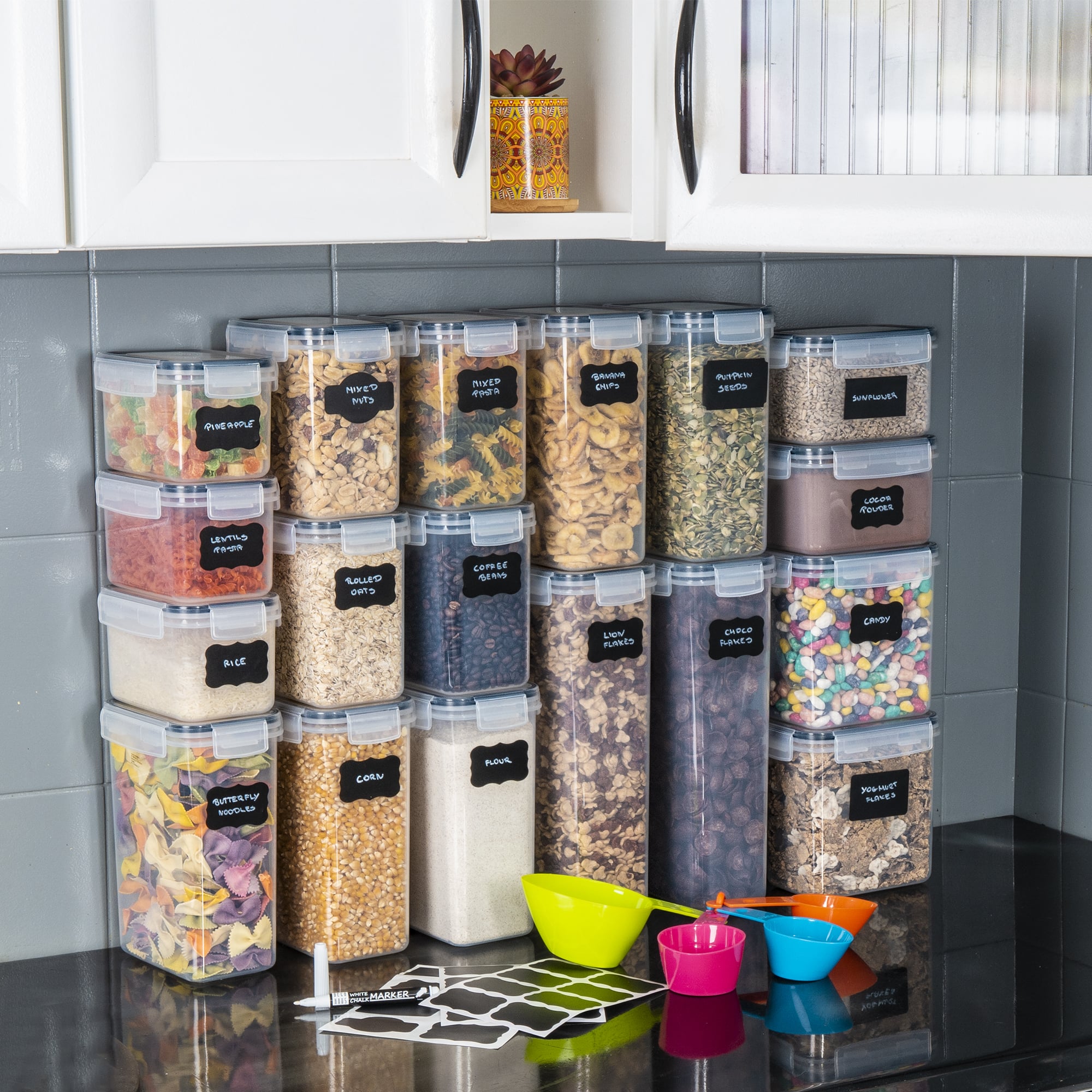 Naš komplet je idealen za shranjevanje prigrizkov, kot so sladkarije, granola, oreščki in piškoti, osnovnih živil, kot je moka, in živil za zajtrk, kot je kava. Shranjevanje v teh prozornih posodah je enostavno, živila pa bodo dobro organizirana in vedno pri roki. Nikoli več se vam ne bo zgodilo, da bi pozabili, kam ste nekaj shranili!