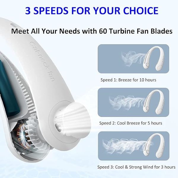 Ventilator za vrat, izdelan iz ABS materiala in mehkega silikona, ima 360-stopinjsko prilagodljivo zasnovo vrtenja,
